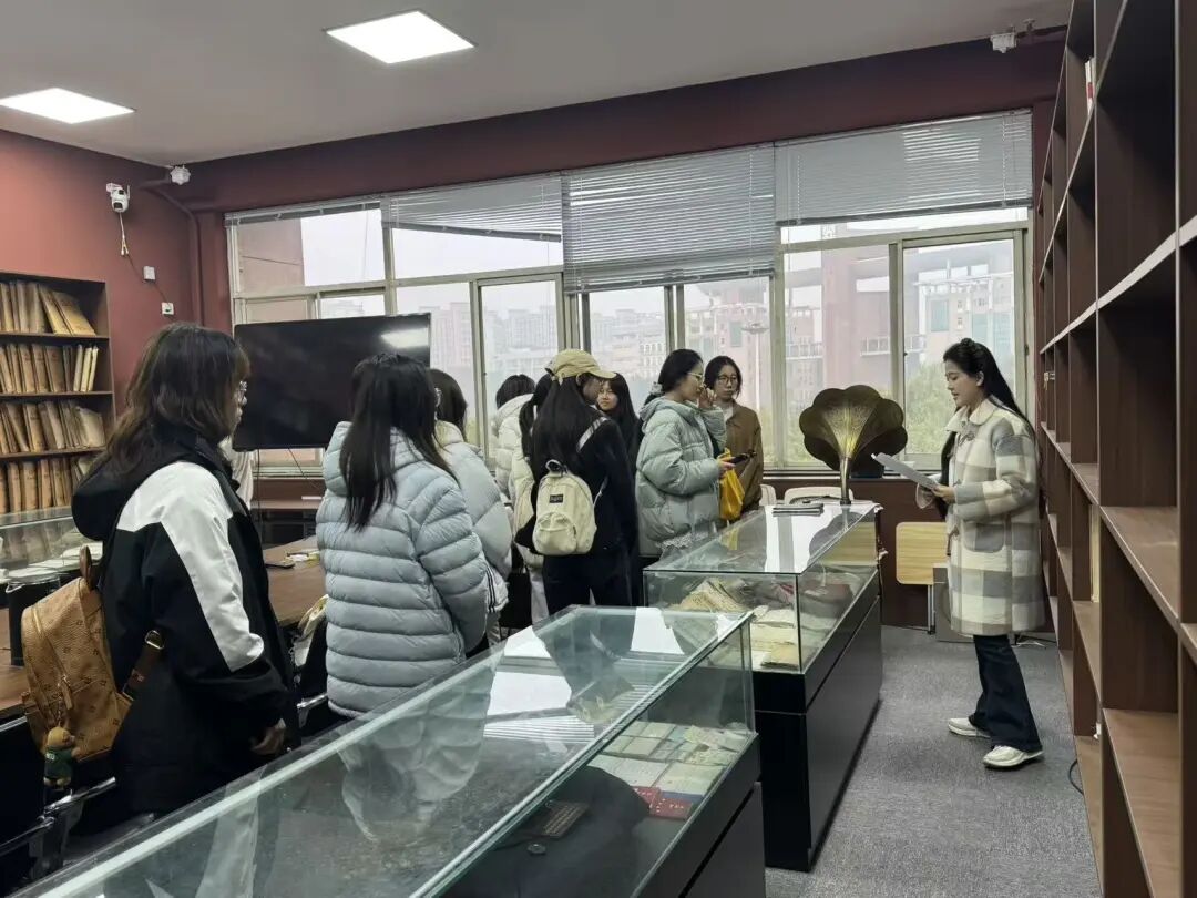 随后来到了何微藏书馆,在讲解员的引导下缓缓前行,目光掠过一排排泛黄的新闻学著作、珍贵的手稿原件与成套的法学典籍。书页间的字迹仿佛化作跨越时空的对话,让大家真切感受到先生深耕新闻传播学领域的严谨态度与治学精神。在专题展示区,通过图文展板与实物陈列,同学们深入了解到何微先生在新闻理论构建、法学与新闻学交叉研究等方面的卓越贡献,更读懂了这份藏书背后“以书育人、以文化人”的深厚内涵。
